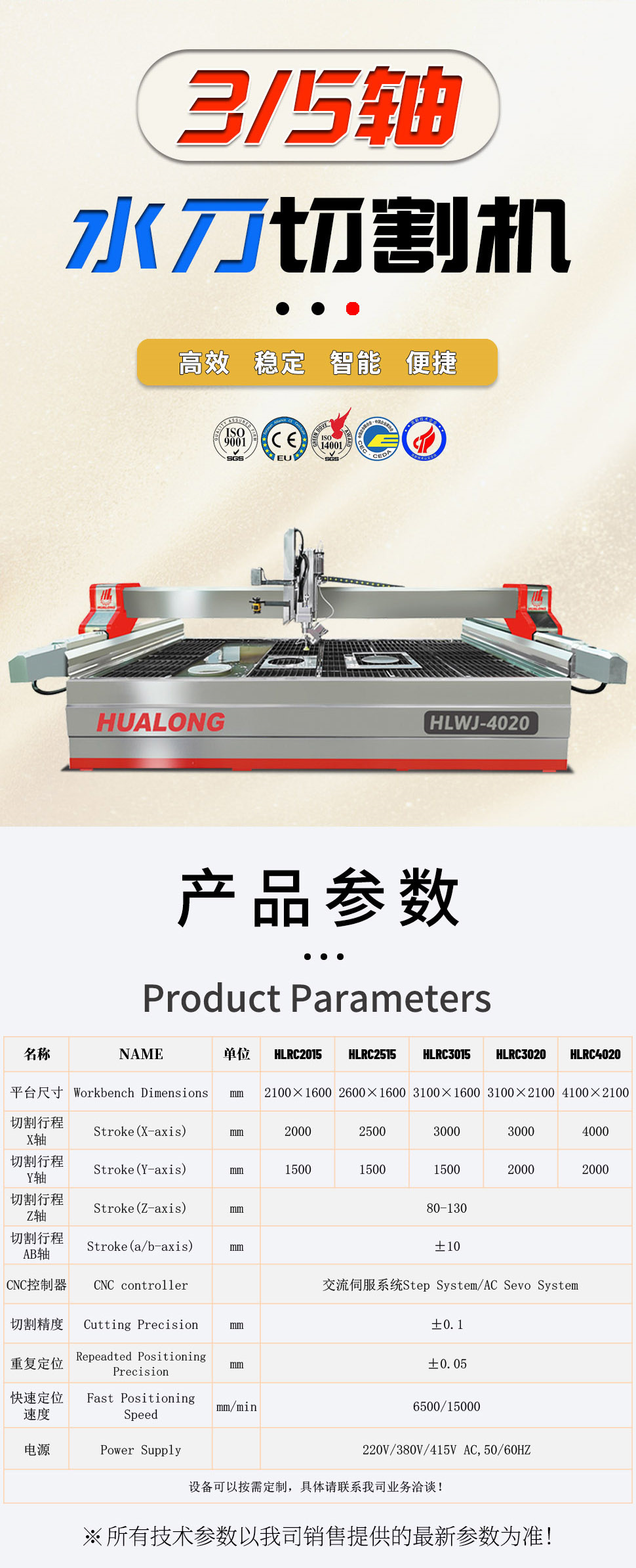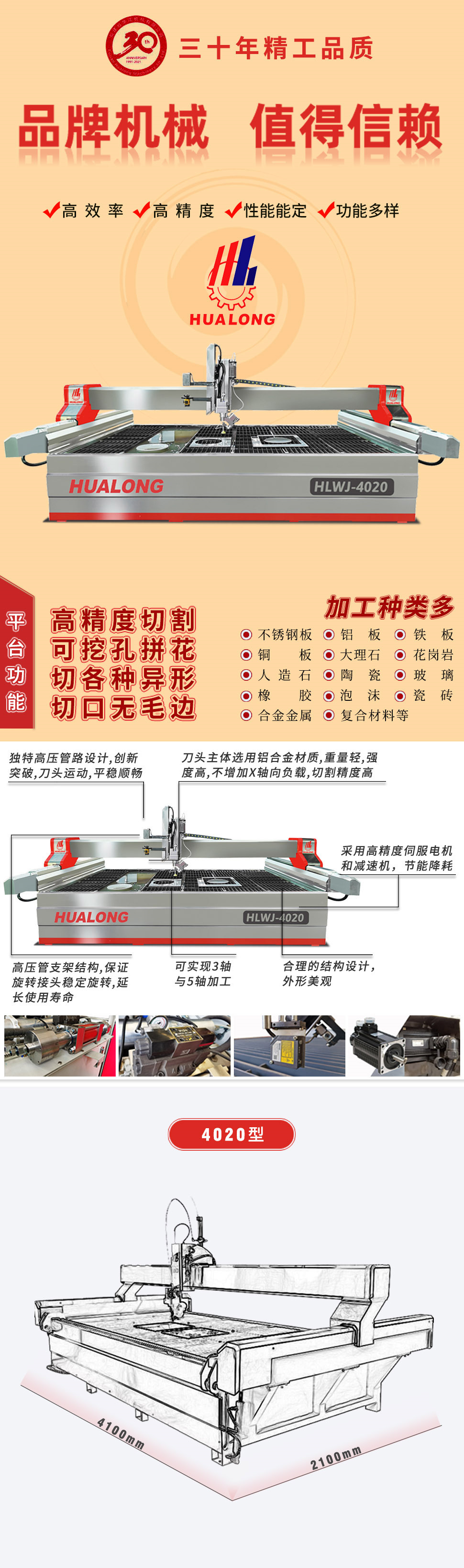 HLRC-4020, which using a very high-pressure jet of water and abrasive (typically garnet) to erode a narrow line in the stock material, is an industrial tool capable for cutting almost any material while maintaining high precision.